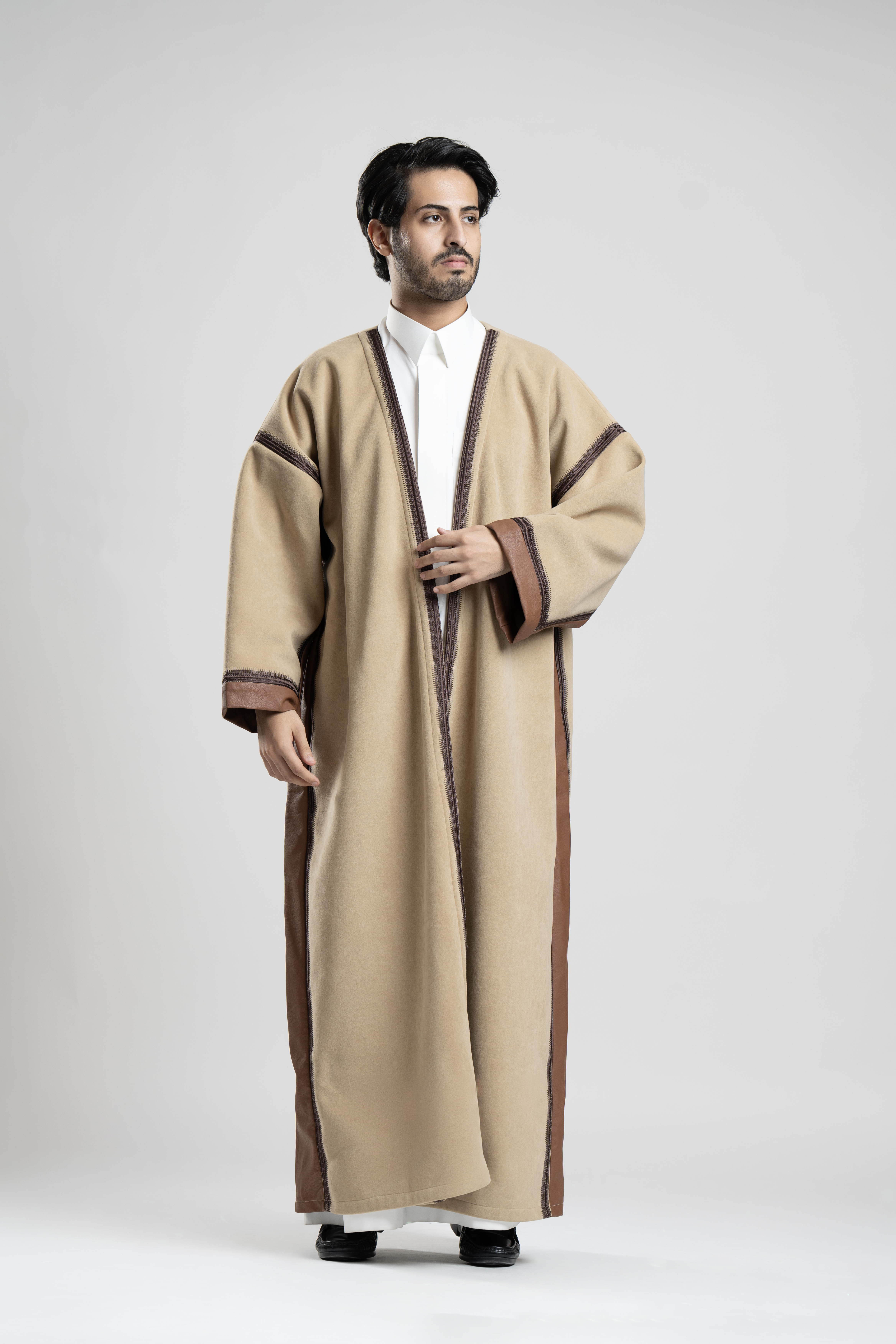 Men's Beige Wool Bisht Decorated with Brown Leather and Traditional Zari Embroidery