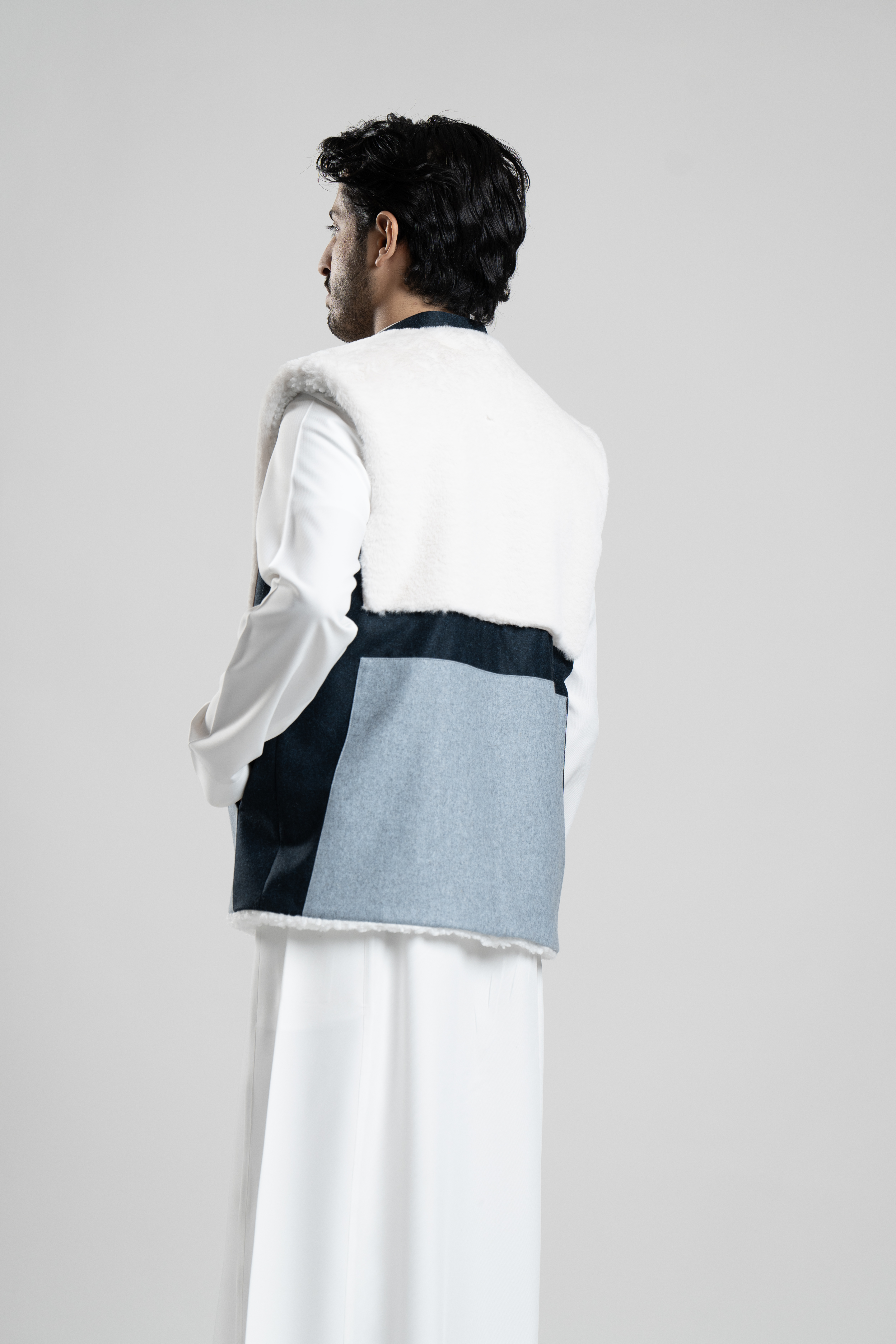 Men's Navy Wool Vest Decorated with White Fur and Blue Wool