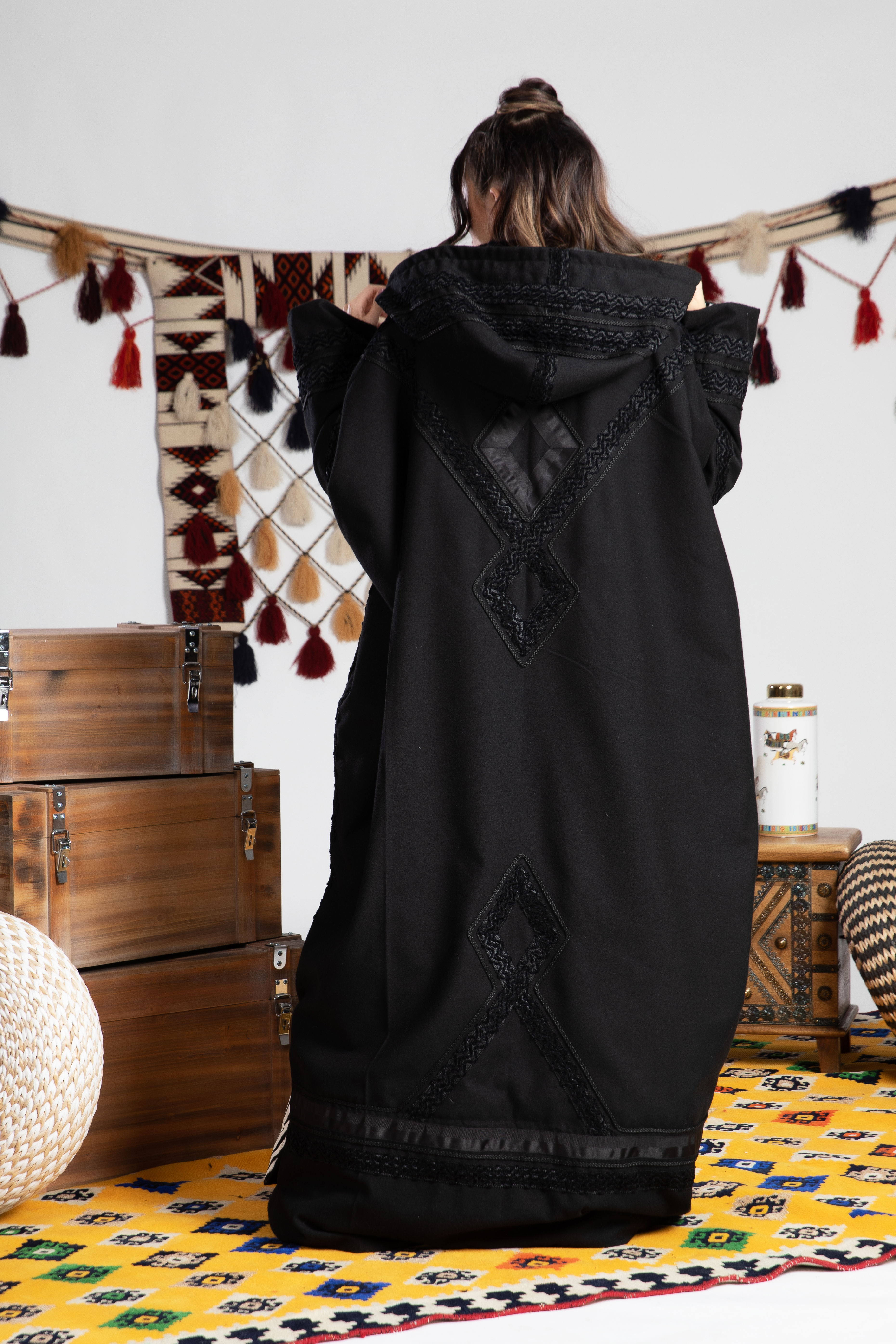 Women's Black Farwa (Deerity Collections) with Hand Draw Saudi Pattern, and Pure Rabbit Fur